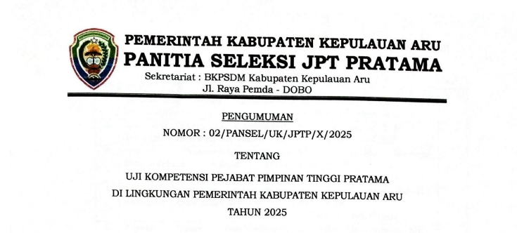 Dalam rangka Uji Kompetensi Pejabat Pimpinan Tinggi Pratama Kabupaten Kepulauan Aru Tahun 2025, bersama ini disampaikan kepada Pegawai Negeri Sipil di Lingkungan Pemerintah Kabupaten Kepulauan Aru yang namanya tersebut dalam pengumuman ini, wajib mengikuti Uji Kompetensi Pejabat Pimpinan Tinggi Pratama Kabupaten Kepulauan Aru Tahun 2025, pengumuman lengkap klik link di bawah ini: